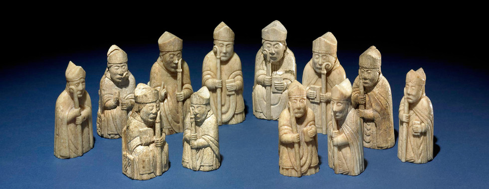 Peça de xadrez em marfim de morsa, representando a imagem de um bispo com báculo e livro, sentado num trono decorado com dois painéis de folhas. (CC BY-NC-SA).